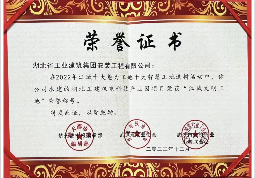 湖北工建機(jī)電科技產(chǎn)業(yè)園項(xiàng)目榮獲武漢市安全文明示范項(xiàng)目和湖北省安全文明示范項(xiàng)目